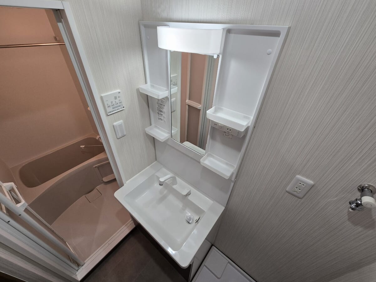 シンプルなデザインの使いやすい洗面台を設置しております。朝の身支度から夜のリラックスタイムまで毎日の生活で重要な役割を果たします。コンパクトながらも効率的な収納スペースを備えており洗面用品やタオルなどを整理もいやすくすっきりとした空間を保ちますね。