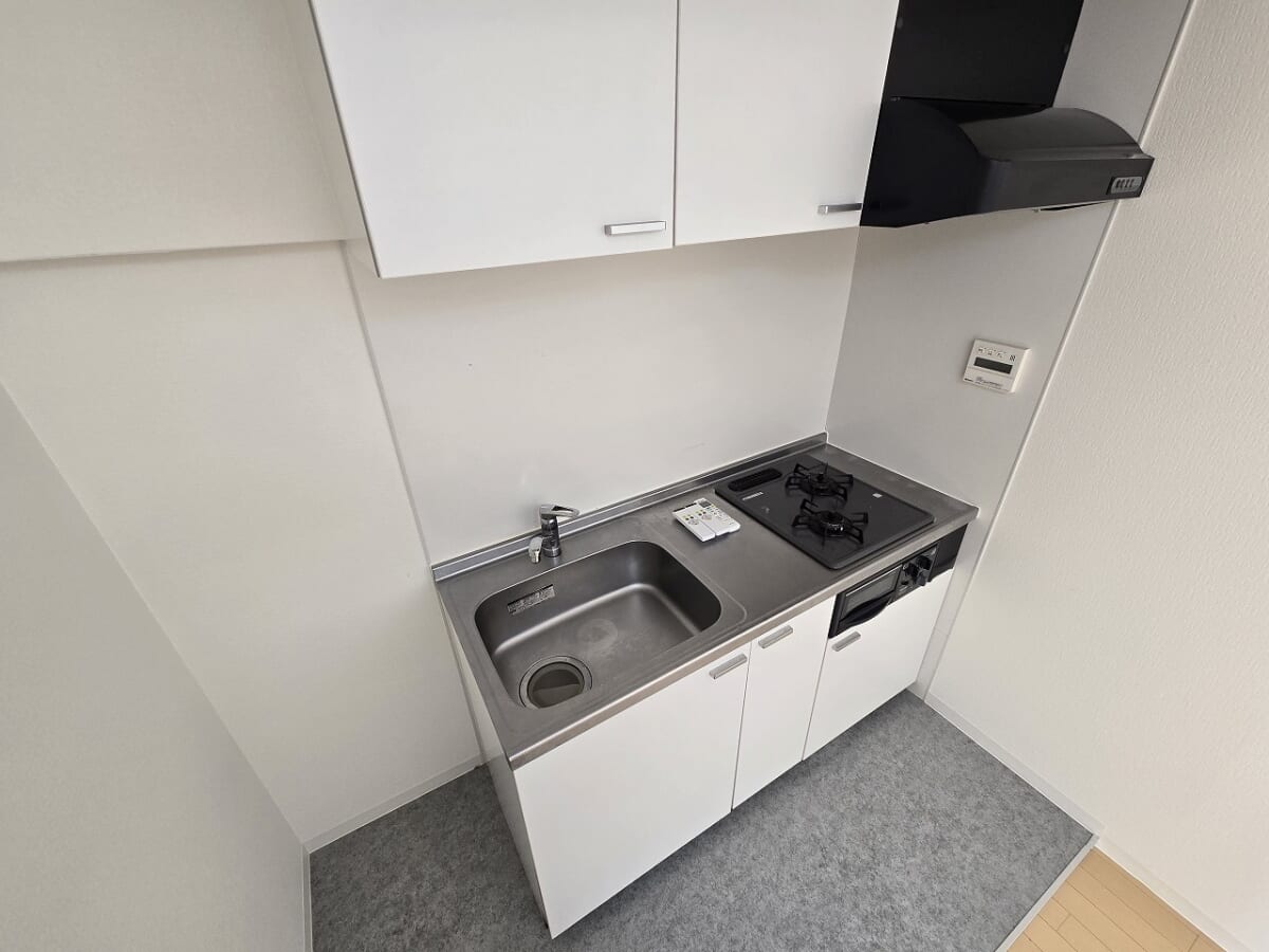 システムキッチンにはガスコンロが設置されています。お料理がお好きな方にうれしい2口のコンロになっていますのでお料理の幅が広がりますよ。1口コンロより時短にもなるのでうれしいポイントですね。キッチンには上部と下部に収納がありますので調理器具や調味料などの収納も可能です。調理器具の出し入れなどがしやすくお料理がしやすいキッチンです。