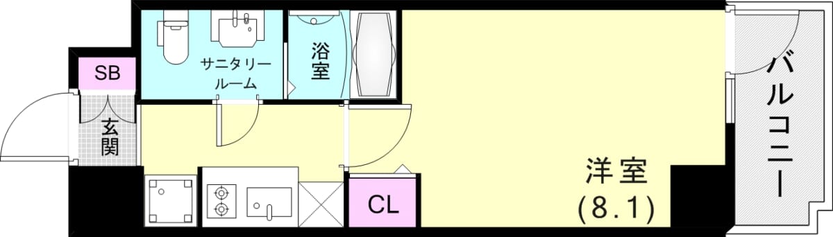 まず、間取りは洋室が8.1帖あり、広々使えるお部屋になっています。洋室にはクローゼットがあり、お洋服や荷物が多い方にはとても助かりますよね。なんと、お風呂、トイレ、洗面所が別で浴室乾燥機まで完備されており生活がとてもしやすいお部屋になっております。
