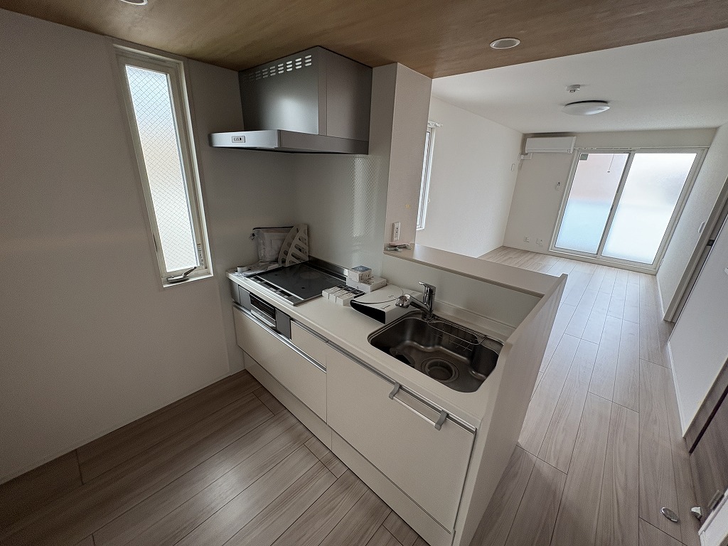 キッチンはIHコンロ3口タイプのシステムキッチン。小さなお子様がいらっしゃるご家庭では、お子様の様子が見ながら調理ができるので人気が高いですよ。カウンターのリビング側が収納棚になっているので、絵本やおもちゃなどを収納することができますよ。IHコンロなので、使用後のお手入れが簡単。空いた時間でお子様に絵本を読んであげられますね。
